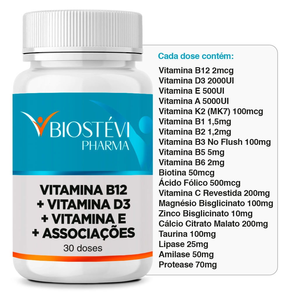 Vitamina A 5000UI Vitamina D3 2000UI Vitamina E 500UI Vitamina K2 (MK7) 100mcg Vitamina B1 1,5mg Vitamina B2 1,2mg Vitamina B3 No Flush 100mg Vitamina B5 5mg Vitamina B6 2mg Vitamina B12 2mcg Biotina 50mcg Ácido Fólico 500mcg Vitamina C Revestida 200mg Magnésio Bisglicinato 100mg Zinco Bisglicinato 10mg Cálcio Citrato Malato 200mg Taurina 100mg Lipase 25mg Amilase 50mg Protease 70mg |