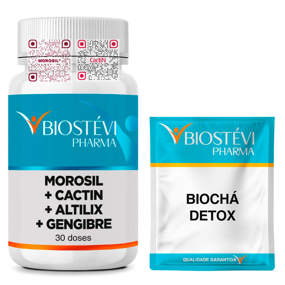 Cada 1 Dose (3 Cápsulas) Contém: Morosil® 500mg CactiN® 500mg Altilix ® 100mg Gengibre (Zingiber officinale root) 100mg Excipiente* q.s.p. Composição Biochá Detox Chá verde 150mg Carqueja 300mg Cavalinha 300mg Gengibre 150mg Alecrim 100mg Hibiscus 200mg Base chá sabor limão qsp 1 dose 30 sachês |