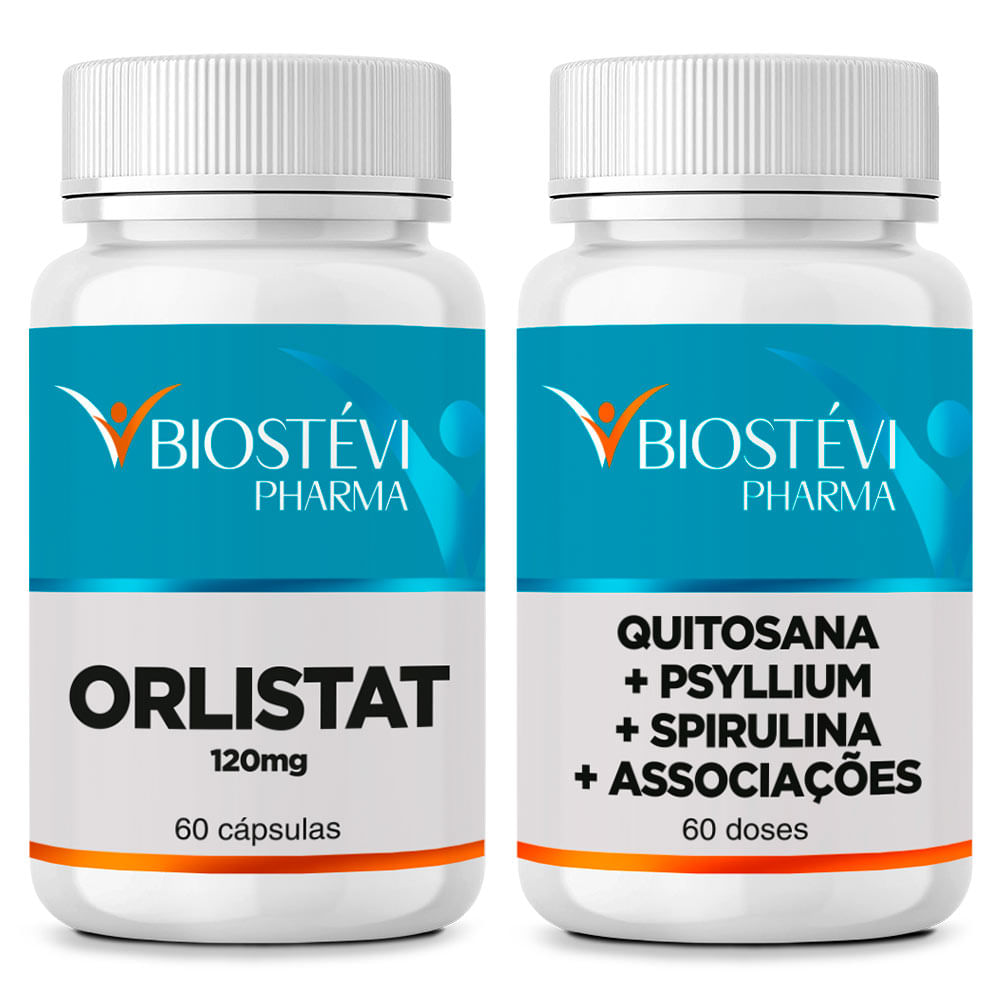 | Composição | Orlistate: Frasco contendo 60 cápsulas Cada cápsula contém Orlistate 120mg* Excipiente q.s.p Quitosana + Psyllium + Spirulina + Associações: Cada dose contém: Quitosana 300mg Psyllium 300mg Spirulina 300mg Picolinato de Cromo 100mcg Goma Guar 50mg Vitamina C 50mg Excipiente q.s.p Frasco contendo 60 Doses = 120 cápsulas. |