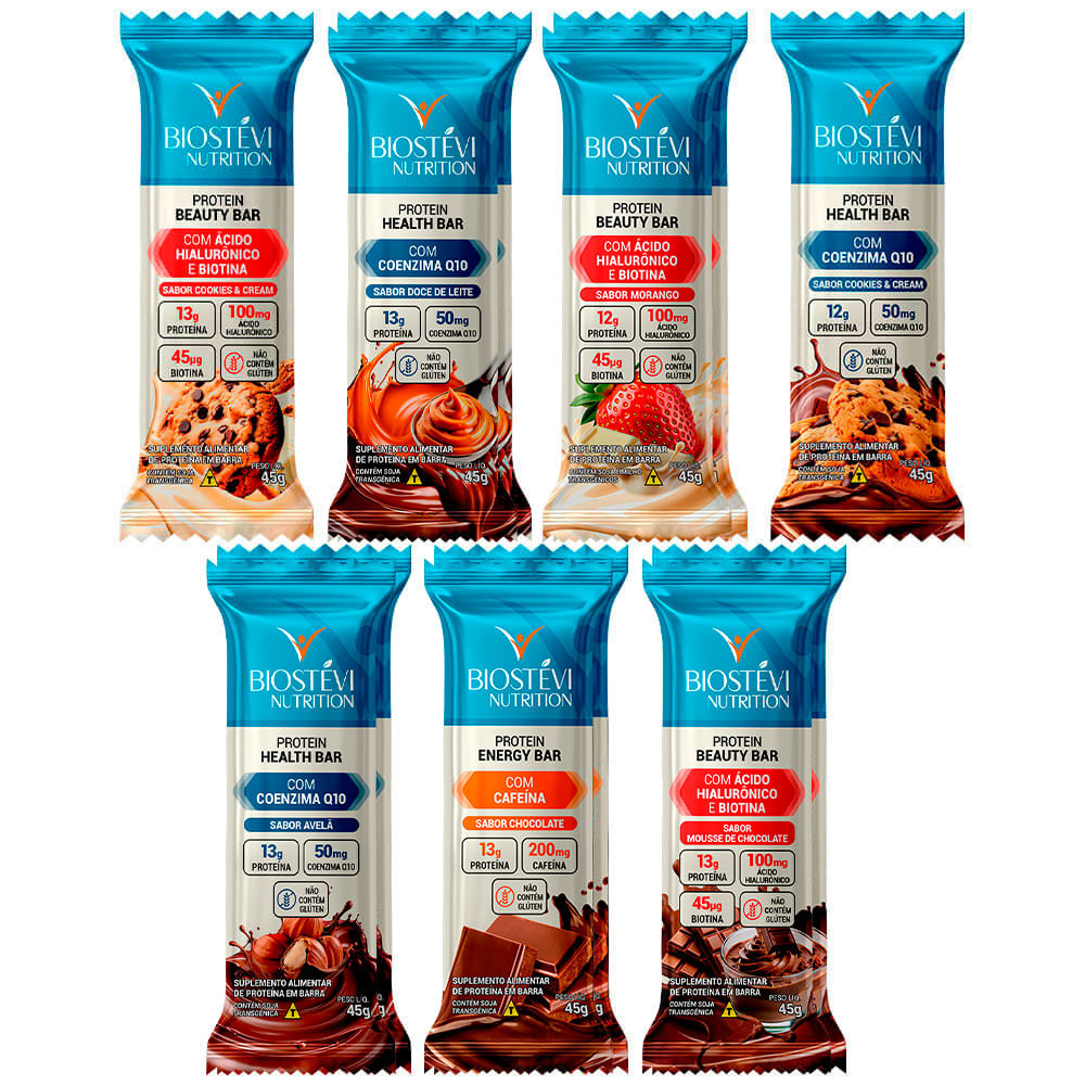 2 Protein Enery Bar (Sabor Chocolate); 1 Protein Health Bar (Sabor Cookies & Cream); 2 Protein Health Bar (Sabor Doce de Leite); 2 Protein Health Bar (Sabor Avelã); 1 Protein Beauty Bar (Sabor Cookies & Cream); 2 Protein Beauty Bar (Sabor Morango); 2 Protein Beauty Bar (Sabor Mousse de Chocolate). Protein Beauty Bar com Ácido Hialurônico e Biotina (Sabor Morango) 45g Nutrition Protein Beauty Bar com Ácido Hialurônico e Biotina (Sabor Mousse de Chocolate) 45g Nutrition Protein Beauty Bar com Ácido Hialurônico e Biotina (Sabor Cookies&Cream) 45g Nutrition Protein Health Bar com Coenzima Q10 (Sabor Cookies&Cream) 45g Nutrition Protein Health Bar com Coenzima Q10 (Sabor Doce de Leite) 45g Nutrition Protein Health Bar com Coenzima Q10 (Sabor Avelã) 45g Nutrition Protein Energy Bar com Cafeína (Sabor Chocolate) 45g Nutrition |