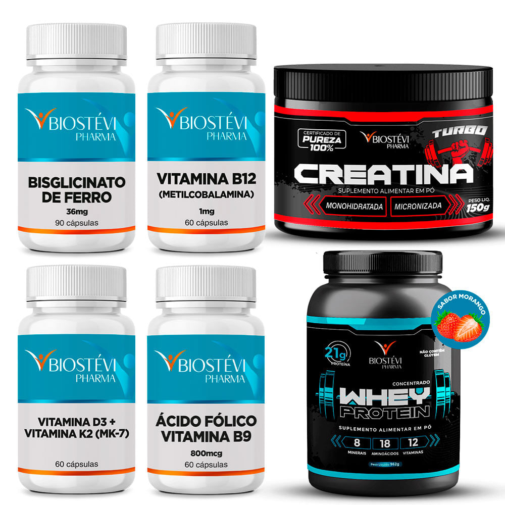 - Ajuda no aumento de massa magra; - Favorece a melhora da resistência muscular; - Auxilia na melhora capacidade anaeróbica; - Contribui para o aumento de força e potência; - Ajuda na recuperação muscular; - Colabora para o fortalecimento dos ossos. Bisglicinato de Ferro - Ajuda combater a anemia; - Favorece a reposição da carência de ferro; - Auxilia na melhora da oxigenação sanguínea; - Contribui para o fortalecimento da imunidade; - Colabora para a melhora do índice de conversão dos alimentos. Whey Protein Concentrado 80% - Poderosa fonte de proteínas; - Auxilia na recuperação muscular; - Ajuda na hipertrofia muscular; - Contribui para o fortalecimento do sistema imunológico; - Colabora para um melhor desempenho durante os exercícios físicos. Vitamina B12 - Ajuda combater a distrofia muscular; - Favorece o combate da deficiência de vitamina B12; - Contribui para a proteção contra doenças neurológicas; - Auxilia no tratamento de insônia; - Colabora para a melhora do sistema imunológico. Vitamina D3 + Vitamina K2 - Favorece o equilíbrio das defesas do corpo (sistema imunológico); - Ajuda no controle da pressão arterial; - Favorece a proteção contra a formação de tumores; - Auxilia na Inibição de processos inflamatórios; - Colabora para o metabolismo dos carboidratos. Ácido Fólico - Suplementação alimentar; - Contribui para o tratamento de anemia; - Ajuda na proteção contra doenças hepáticas; - Favorece a gestação; - Fotoproteção e combate a efeitos nocivos da radiação; - Colabora para a prevenção e tratamento da queda capilar. |