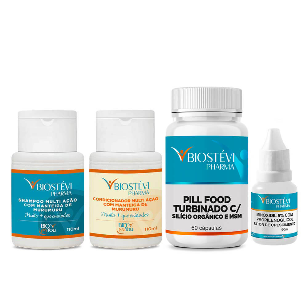 | Modo de Usar | Shampoo: Aplicar nos cabelos úmidos, massagear sem esfregar, deixar agir por 1 minuto, remover com água em abundância Condicionador: Aplicar nos cabelos úmidos, massagear sem esfregar, deixar agir por 1 minuto, remover com água em abundância Minoxidil com Fator de Crescimento: Aplicar 20 gotas no couro cabeludo seco massageando, à noite. Pill Food Turbinado: Ingerir 1 cápsula duas vezes ao dia ou conforme orientação de um profissional habilitado. |