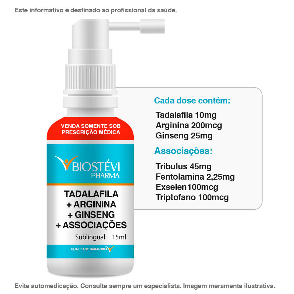 Tadalafila 10mg Tribulus 45mg Arginina 200mcg Ginseng 25mg Fentolamina 2,25mg Exselen 100mcg Triptofano 100mcg Frasco contendo 25 doses (cada dose = 4 borrifadas) |