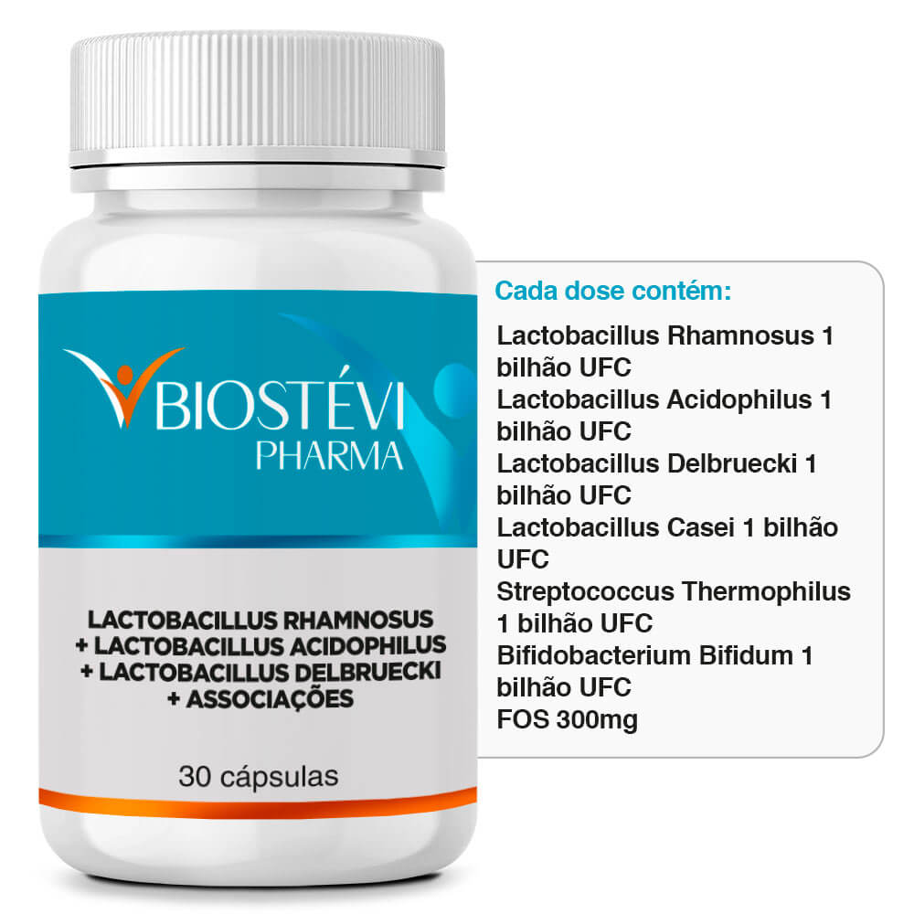 Lactobacillus Rhamnosus 1bilhão de UFC Lactobacillus Acidophilus 1bilhão de UFC Lactobacillus Delbruecki 1bilhão de UFC Lactobacillus Casei 1bilhão de UFC Strepetococcus Thermophilus 1bilhão de UFC Bifidumbacterium Bifidum 1bilhão de UFC FOS 300mg Excipiente q.s.p Frasco contendo 30 cápsulas. |